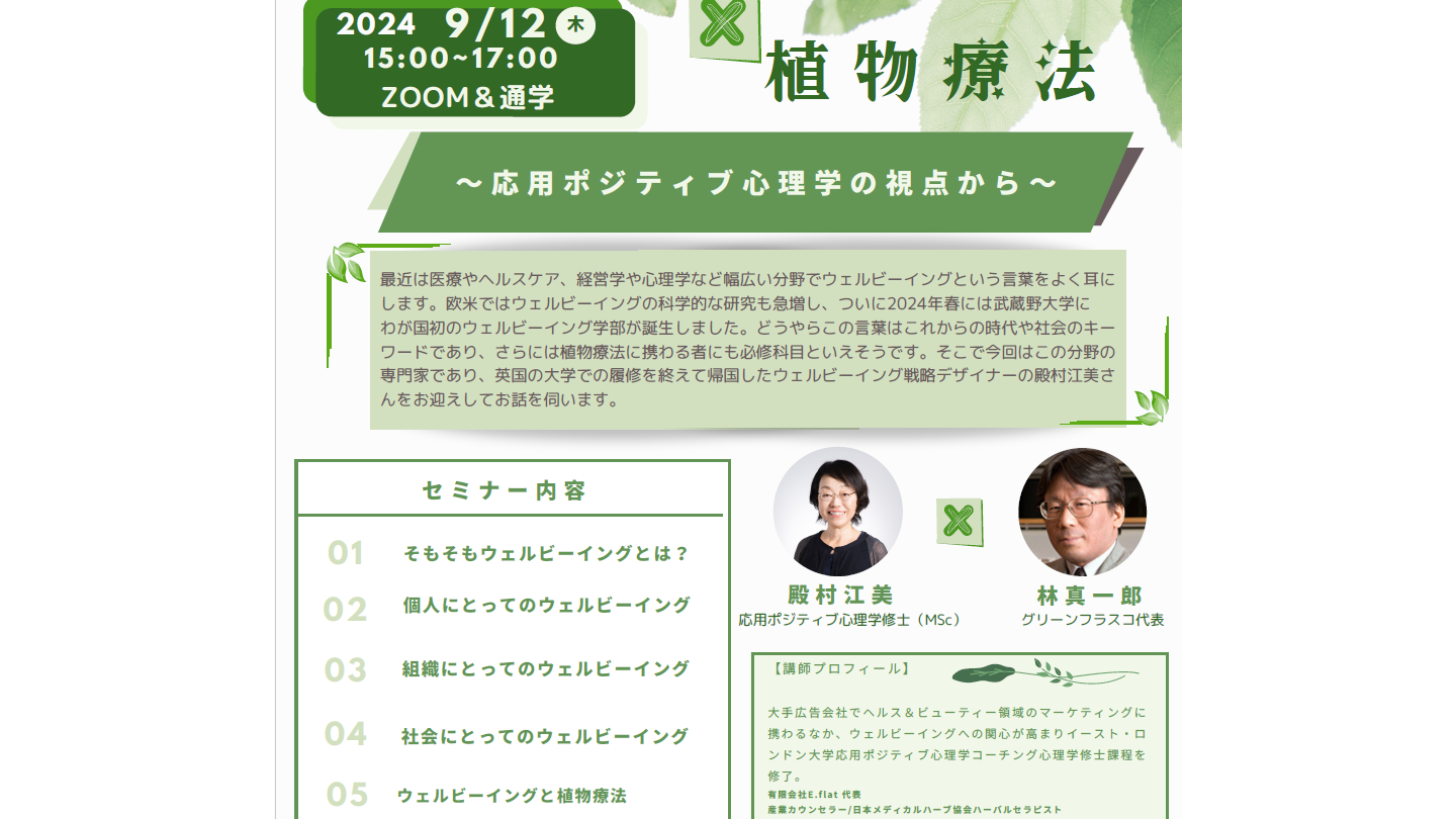 9月12日、株式会社グリーンフラスコ主催オンラインセミナーにて、「ウェルビーイング×植物療法」をテーマにお話をしました。